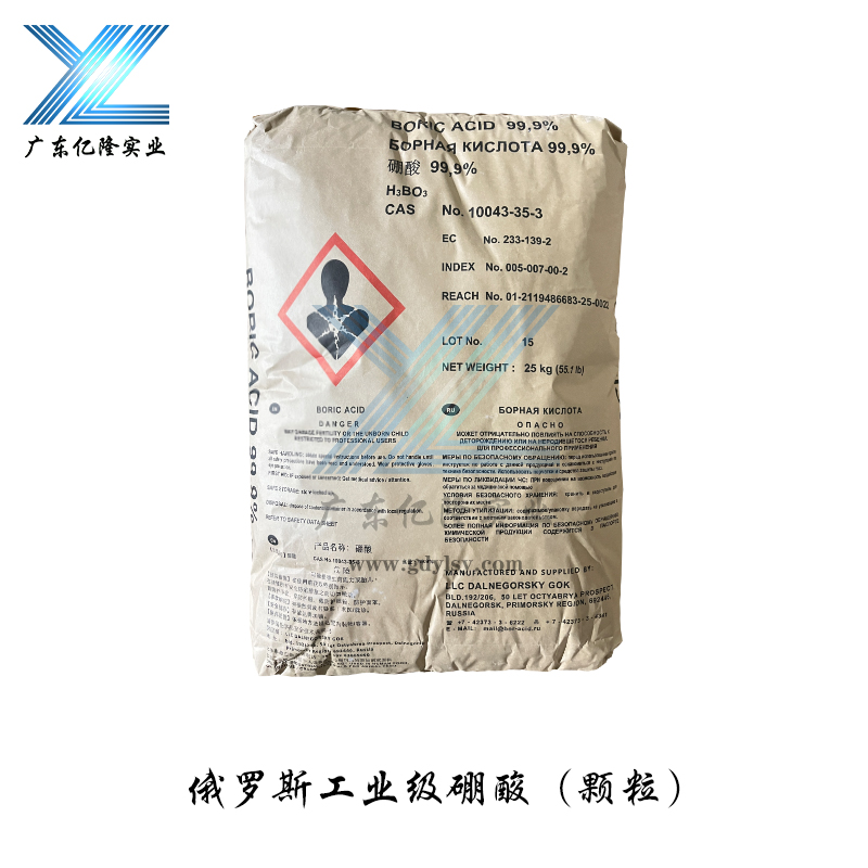 硼酸,为白色粉末状结晶或三斜轴面鳞片状光泽结晶,有滑腻手感,无臭味。溶于水、酒精、甘油、醚类及香精油中,水溶液呈弱酸性。大量用于玻璃(光学玻璃、耐酸玻璃、耐热玻璃、绝缘材料用玻璃纤维)工业,可以改善玻璃制品的耐热、透明性能,提高机械强度,缩短熔融时间。