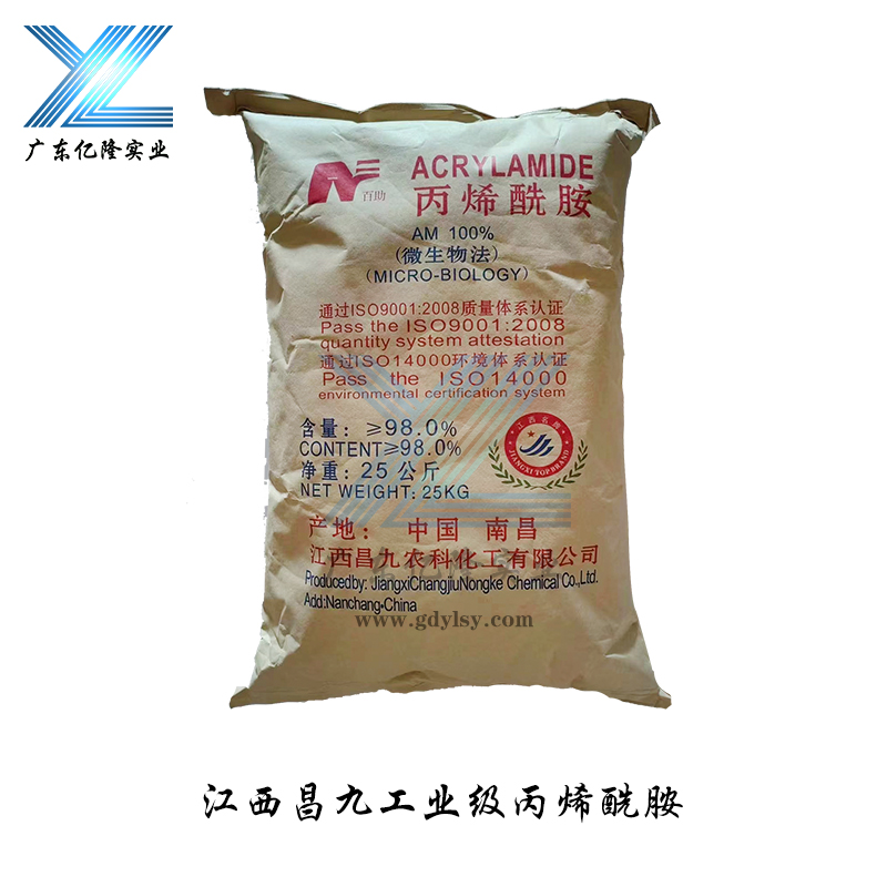 丙烯酰胺是一种不饱和酰胺,别名AM,其单体为无色透明片状结晶,沸点125℃(3325Pa),熔点84~85℃,密度1.122g/cm3。能溶于水、乙醇、乙醚、丙酮、氯仿,不溶于苯及庚烷中,在酸碱环境中可水解成丙烯酸。是有机合成材料的单体,生产医药、染料、涂料的中间体。丙烯酰胺单体在室温下很稳定,但当处于熔点或以上温度、氧化条件以及在紫外线的作用下很容易发生聚合反应。当加热使其溶解时,丙烯酰胺释放出强烈的腐蚀性气体和氮的氧化物类化合物。